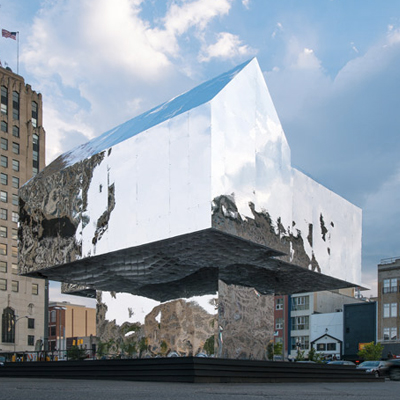 Mark’s House, tells the story of an imagined Flint resident, Mark Hamilton, whose family loses its home to foreclosure. The pavilion appears as a Tudor-style house suspended mid-air, reflecting the city that surrounds it. Through the sleight-of-hand of a narrow column clad in reflective material, the supportive structure disappears, making the house appear to hover aboveground. The rest of the pavilion is wrapped in mirrored panels, so that the surrounding city and the sky bounces off its skin. The pavilion is a literal and figurative reflection of the city it is located in. The architects write: “Mark’s house … reflects back the trees, the streets, the sill windows, and the midwestern sky, and most importantly, the people of Flint.”